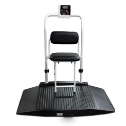Rice Lake Healthweigh 350-10-4 dual-ramp wheelchair scale with seat and handrail allows high capacity, accurate weighing for patients requiring a seat. The padded seat easily tucks away, allowing this model to function as either a wheelchair or chair scale. Convenient keypad tare reduces errors and increases efficiency. Foldable and light, this sturdy scale is easily transported on two heavy-duty rear wheels to any location.