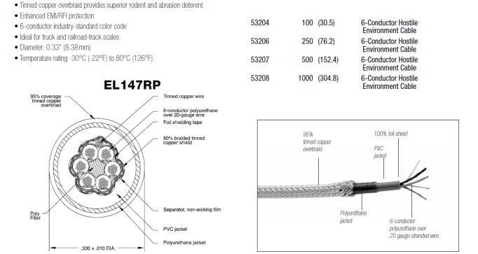 131966 Cable, Load Cell EL147RP Plus 6 Conductor Tinned Copper Overbraid 500ft