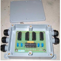 ABS plastic junction box with 4 cell summing card. Overall j-box dimensions are approx: 6.75" x 4.5" x 1.28". Use with (2) to (4) loadcell systems -- Floor, tank, hopper, or livestock applications. Has 4 cable fittings (openings) for load cells and 1 opening for the "homerun" cable.