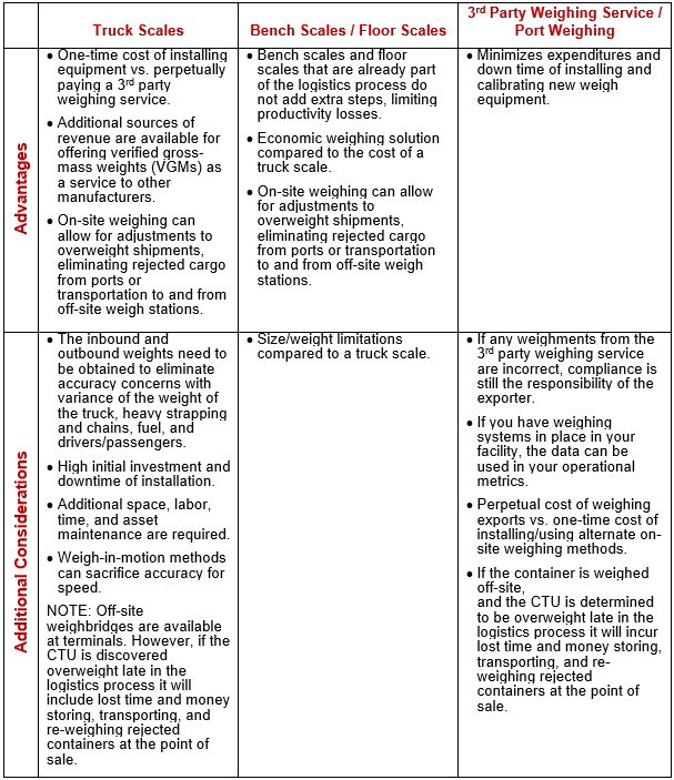 SOLAS guidelines, legally binding on July 1, 2016, for verified gross mass (VGM) reporting specify only two acceptable methods for weighing a cargo transport unit (CTU):
