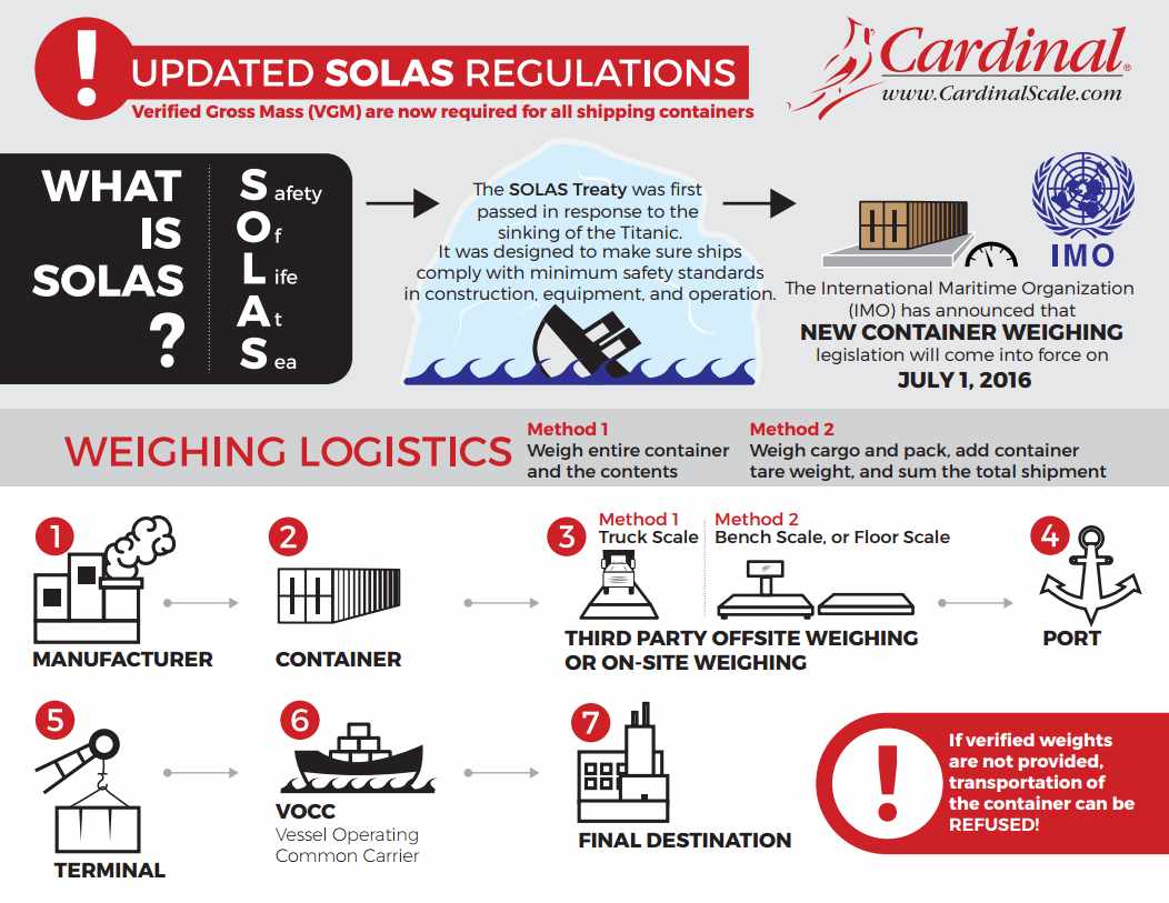 We’ve mentioned SOLAS before but here is just a friendly reminder. Beginning July 1, 2016 changes to the Safety of Life at Sea (SOLAS) treaty will require verified weight certificates for all containers before they are loaded onto a ship. If the certificate is not submitted in a timely matter (12-24 hours prior to stowing cargo), the cargo runs the risk of being refused passage. This new regulation will have a significant impact on several groups, including scale dealers located near ports or working in the overseas logistics industry.