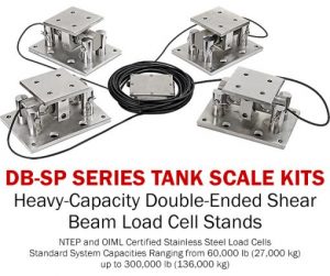 Cardinal Scale Manufacturing DB-SP CenterPoint load cell heavy-capacity mounting kits utilize the time-tested and reliably-proven model DB double-ended stainless steel load cells for mixing tanks that feature a center load design. The stands are available in either stainless steel or mild steel powder-painted industrial tan and they bolt directly to the floor and tank. The DB-SP’s environmentally-sealed load cells are NTEP, OIML, and VCAP certified for quality and accuracy. They provide superior performance in a wide range of process control and vessel weighing applications weighing tanks, bins, hoppers, silos, and mixers.