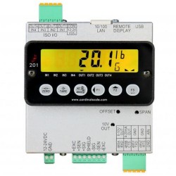 The 201 offers sample rates of up to 200 samples per second and standard communication protocols include serial interface RS232/RS485, mini USB-B, Analog (0-10V or 4-20mA), Ethernet TCP/IP, EIP, and Modbus TCP, making it easy to connect to a PC, PLC, and other smart devices. NTEP, Measurement Canada, CE, and UL.