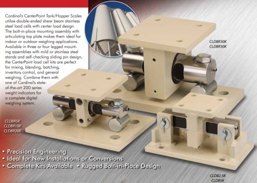The bolt-in-place mounting assembly with articulating top plate makes them ideal for indoor or outdoor weighing applications. Available in three or four legged mounting assemblies with mild or stainless steel stands and self-checking sliding pin design, the CenterPoint load cell kits are perfect for mixing, blending, batching, inventory control, and general weighing. Combine them with one of Cardinal's state of-the-art 200 series weight indicators for a complete digital weighing system.