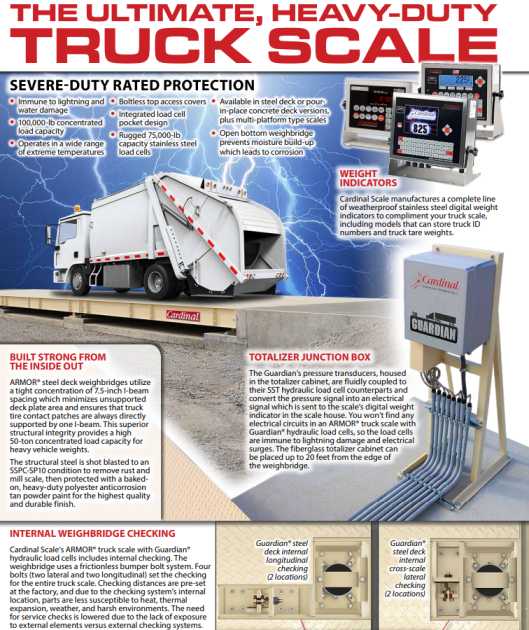 Cardinal Scale’s ARMOR® truck scales with Guardian® hydraulic load cells are the smart choice for demanding applications like solid waste stations, rock quarries, grain elevators, chemical processing applications, and heavy construction. Damage resulting from water, lightning and voltage surges, corrosion, rodents, shock loading, and extreme climatic conditions can dramatically increase the cost of ownership for your truck scale. Guardian® hydraulic load cells are covered under a true lifetime warranty against all of these issues protecting your investment.