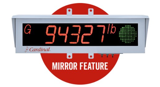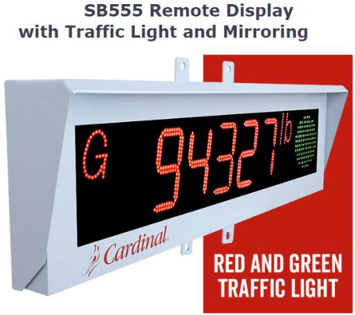 Cardinal Scale Manufacturing model# SB555 remote display features a traffic light and mirroring. The large 5 in/12.7 cm high-intensity dual-row LED display with red-and-green/stop-and-go traffic lights is high visibility for 250 ft/75 m viewing range and +/- 70 degree viewing angle. It comes standard with a mirror feature that mirrors the display every five (5) seconds allowing the weight to be seen in vehicle mirrors when leaving the scale.