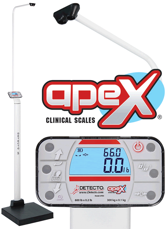 Detecto apex® eye-level digital physician scales feature inline mechanical height rods and an extra-wide, flat platform measuring 17 in W x 17 in D x 2.75 in H. The apex® scale features 600 lb x 0.2 lb / 300 kg x 0.1 kg capacity, 0.75-inch-high clinical-blue LCD weight readouts, BMI calculation, AC or battery power (AC adapter included on some models), 2 RS232 serial ports and 1 micro USB-B port, HL7 IEEE 11073 compliance, Wi-Fi and Welch Allyn connectivity (available on some models), dual wheels for transport, sturdy column construction, integral bubble level, and they assemble quickly right out of the box in just a few easy seconds (no tools required). This scale replaces the models; 6127, 6127KG, 6129, 6129KG, 6337, 6339.