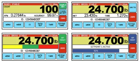 • Indications for Gross, Net, Tare, Count, Piece Weight, % Accuracy, Check Weigh Over/Under/Accept, Setpoint Status, Active ID and Base 2