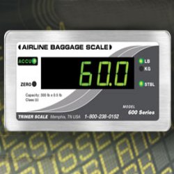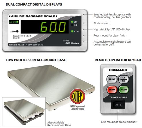 Triner Scale & Manufacturing TS 600 E airline baggage scales feature heavy duty tubular frame base for years of service and the 600 series are often seen in airports all over the United States of America. We also have the TS600 EP curbside baggage weigher as well.